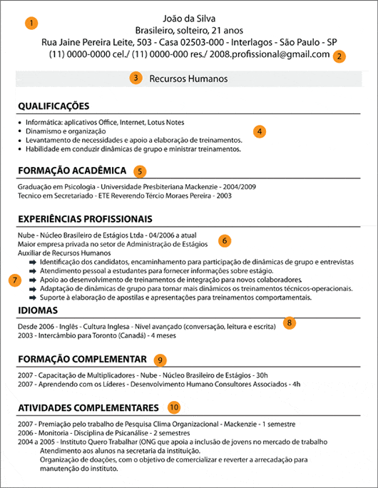 1. Dados pessoais colocados no início facilitam a identificação do candidato. É desnecessário colocar número de documentos ou referências pessoais, exceto quando solicitado pela empresa.